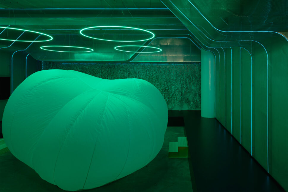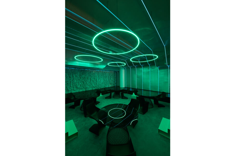 – I och med att det inte finns fönster fick belysningen vara det som skapar en förändringskänsla. I det stora rummet kan man snabbt byta scenario från mötesrum till lounge eller seminarium. Designen är inspirerad av science fiction filmer som till exempel Tron.