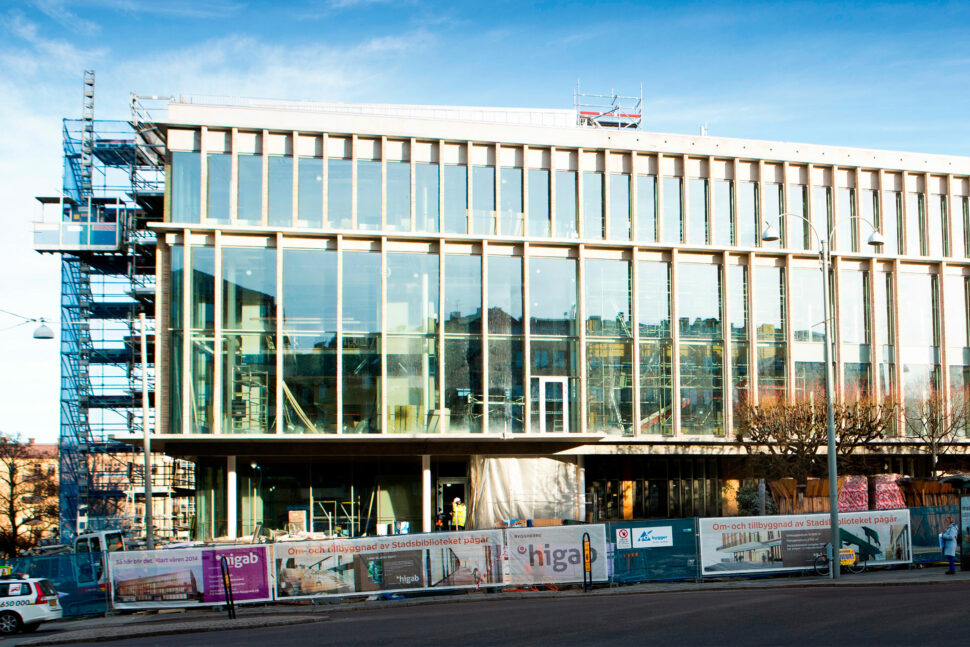 • Biblioteket 8 000 kvadratmeter byggs nu ut med ytterligare 3 000 kvm. Bland annat byggs gallerier längs övervåningarnas fasad mot Kungsportsavenyn och Engelbrektsgatan. Gallerierna är upphänga i järnbalkar som lagts över byggnadens tak – för att inte hindra framkomligheten nere på gatunivå.