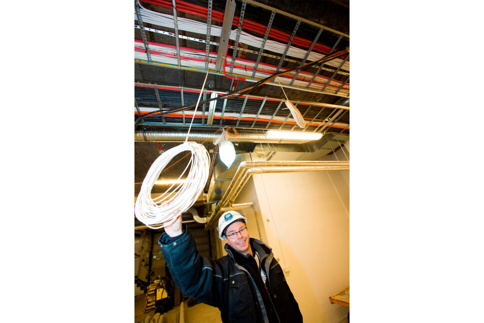 – Det blir mycket jobb med programmering av dimmring, närvarostyrning och sådant, berättar Jonas Cedgard. Jonas är ledande montör på biblioteket och har själv varit med och installerat under månaderna som gått. Han berättar att här finns 24 routrar som nu ska programmeras för att styra belysningen och att det i behövs en dag för arbetet med var och en av dem.