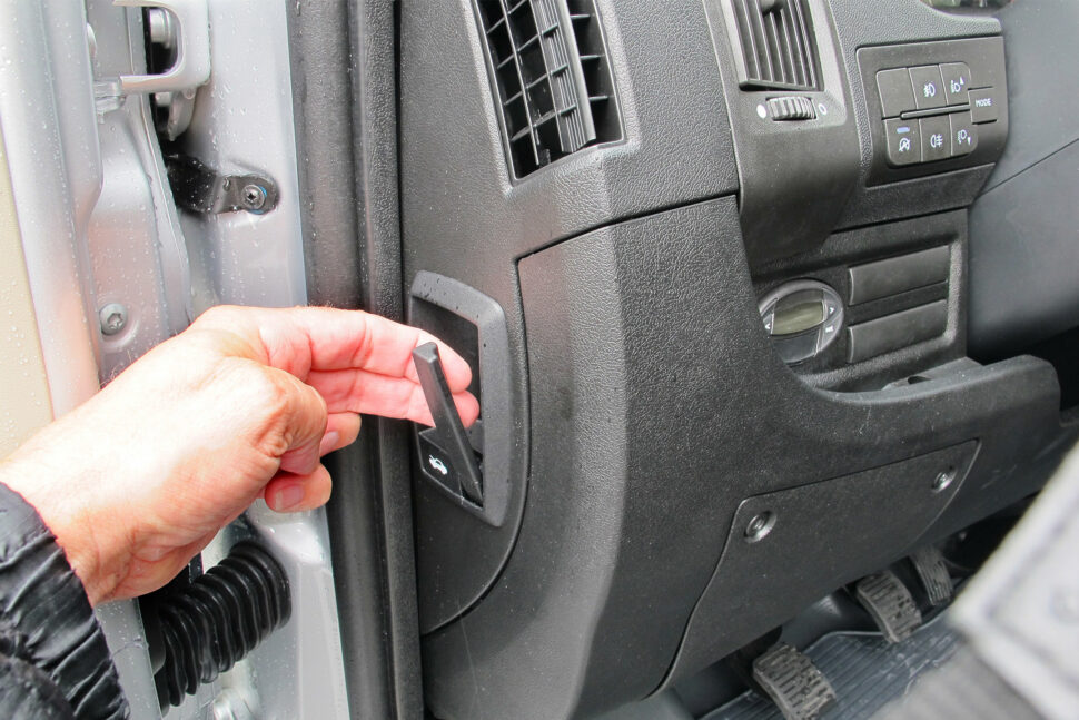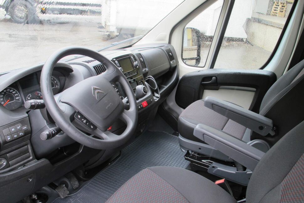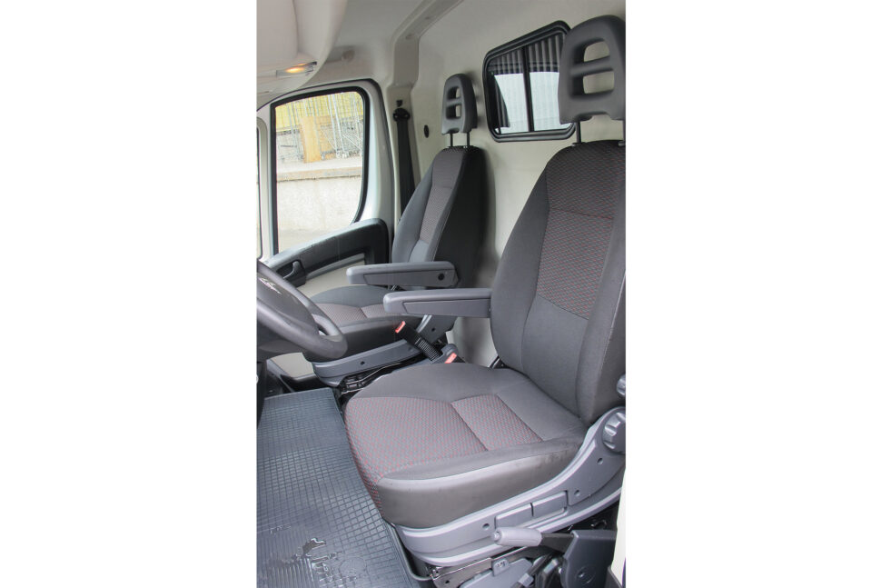I kupén finns två separata säten och ett stort tomt utrymme mellan sätena. Ett plus är växelspaken som sitter uppe på instrumentpanelen. Det ger ännu bättre golvutrymme. Högst upp, i mitten på instrumentpanelen finns ett låsbart utrymme – handsfack för till exempel en laptop. Därinunder sitter en fem tum stor pekskärm som också visar navigation och vad backkameran ser (tillval). Via skärmen styr föraren all infotainment som radio, telefon, GPS eller läser av textmeddelande. Naturligtvis finns här också Bluetooth och USB och 12volts-uttag. Ytterligare ett plus går till den utfällbara skrivplatta överst på instrumentpanelen. Perfekt för arbetsordrar och listor. Förvaringsutrymmen finns i dörrsidorna och under sätena, och ovanför vindrutan finns en praktisk hylla.