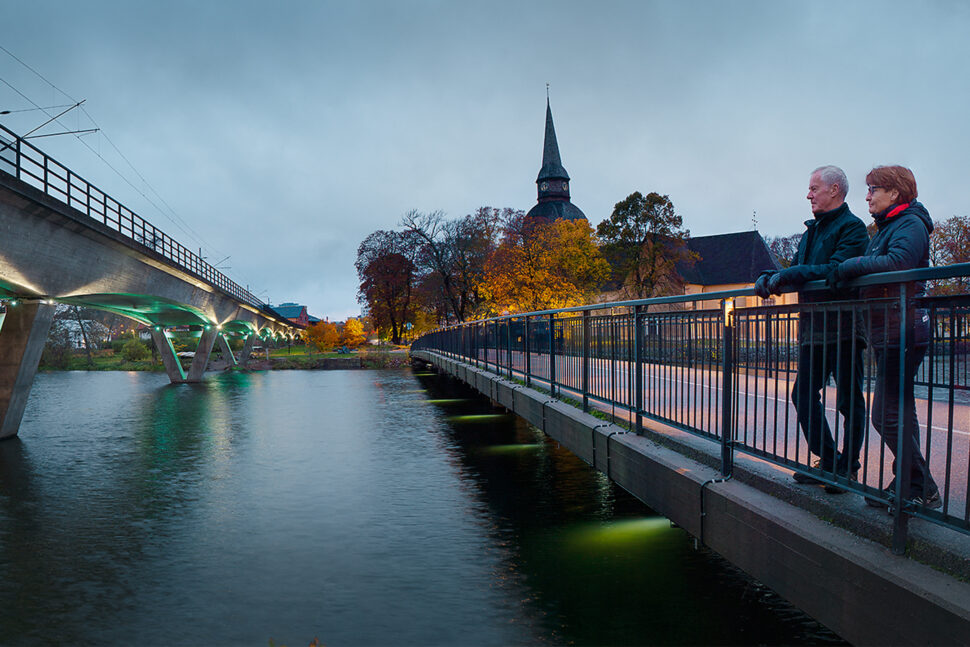 – Vi har lagt massor av tid på kanalisation och att spänna linor, för vi får inte borra i gångbron, bara ytterst lite. Det är en utmaning, men sådant tycker vi om, säger Fredrik Krising, på Belysningsteknik, som skött installationerna på uppdrag av Vattenfall.