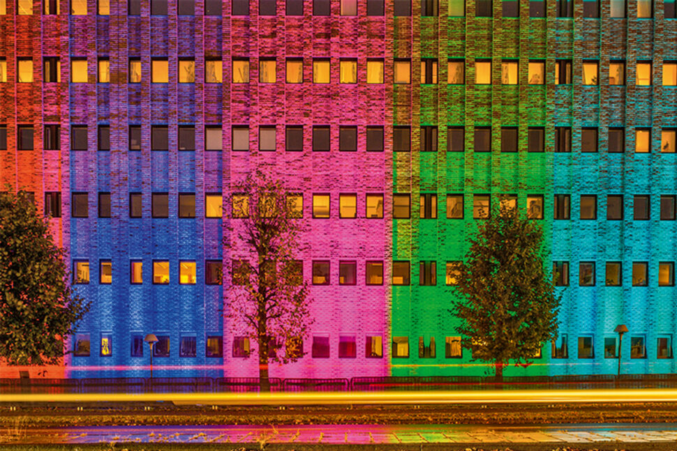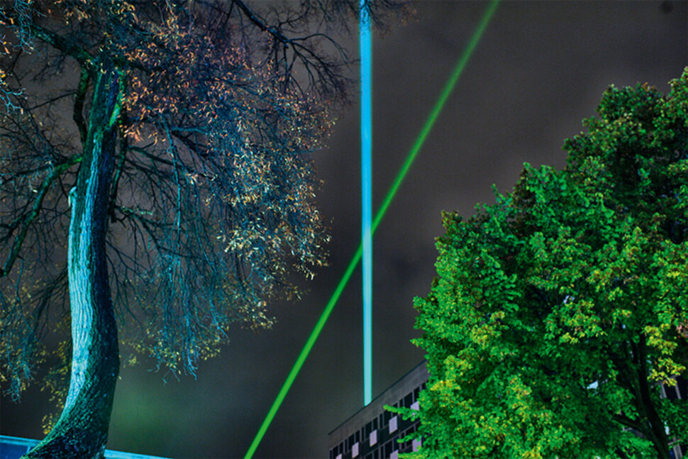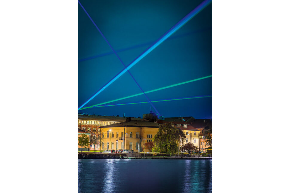 Men åter till laserstrålarna som skar genom kvällshimlen. Vad grejen med dem? Jo, det gröna ljuset som syntes över hela Sörmland var installationen ”Sammanstråla”, en kraftfull laser på centralstationens tak som pekade mot vänstäderna Jyväskylä i Finland, Hasselt i Belgien och Tartu i Estland. Och installationen med sex laserstrålar i blått, grönt och lila som korsade city hette Argon Constellation.