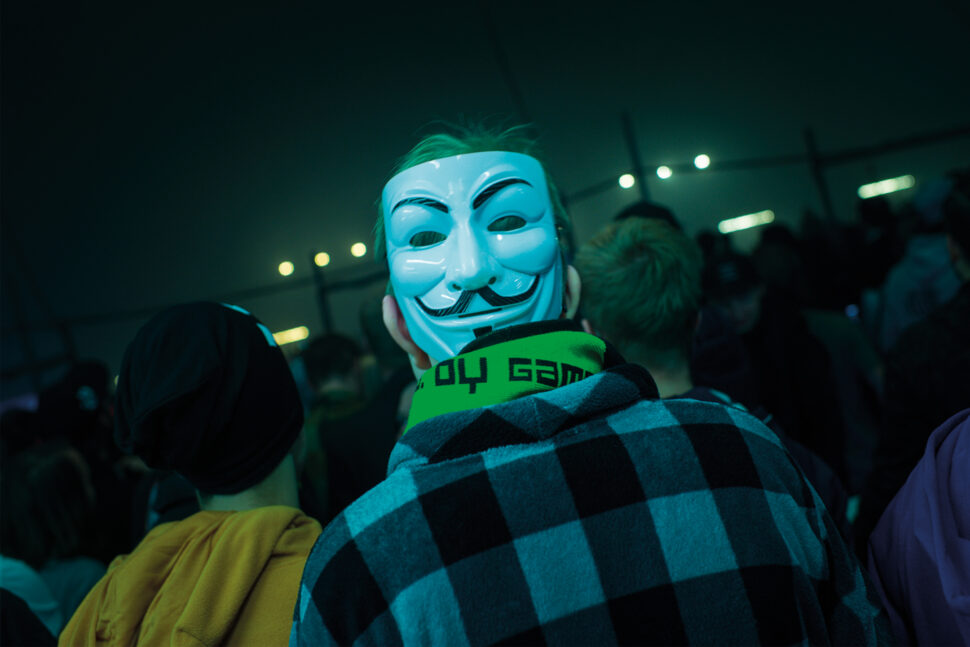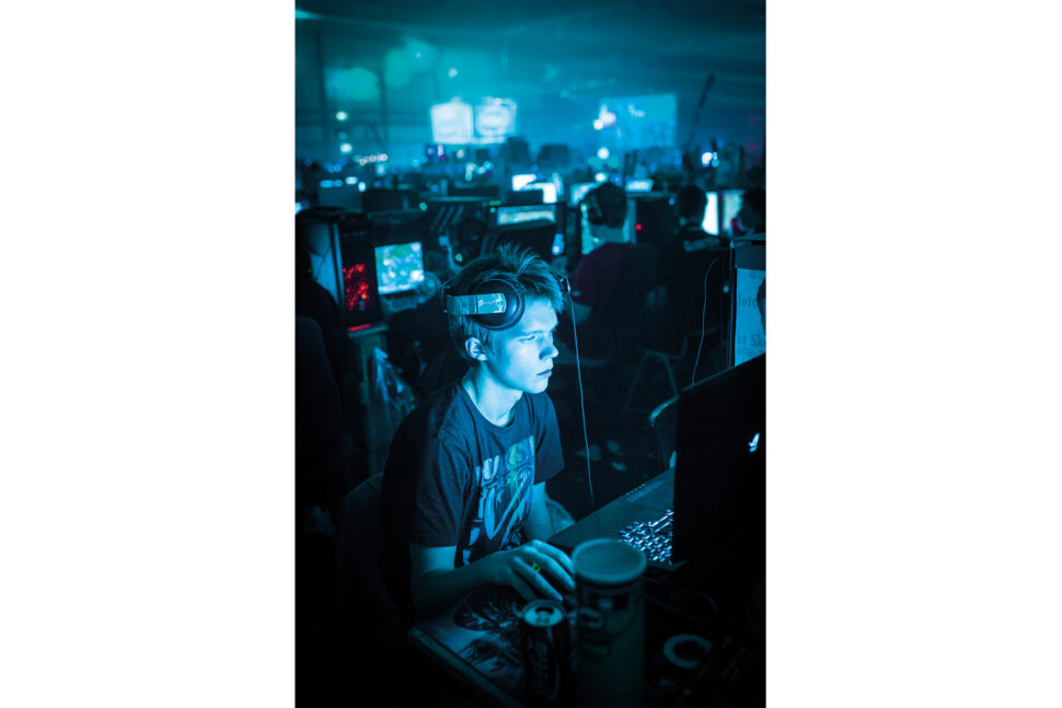 Dennis måste iväg på ett skiftbyte, så vi utforskar evenemanget på egen hand. I två av mässhallarna står långa bord byggda av träpallar och spånskivor. Där har de deltagare som bokat sittplats bänkat sig med datorer, skärmar och prylar. Mest är det unga killar, men det finns även några äldre, och en del tjejer. Många är utklädda – en kille bär heltäckande kycklingdräkt. Andra har roliga mössor och Guy-Fawkes masker.