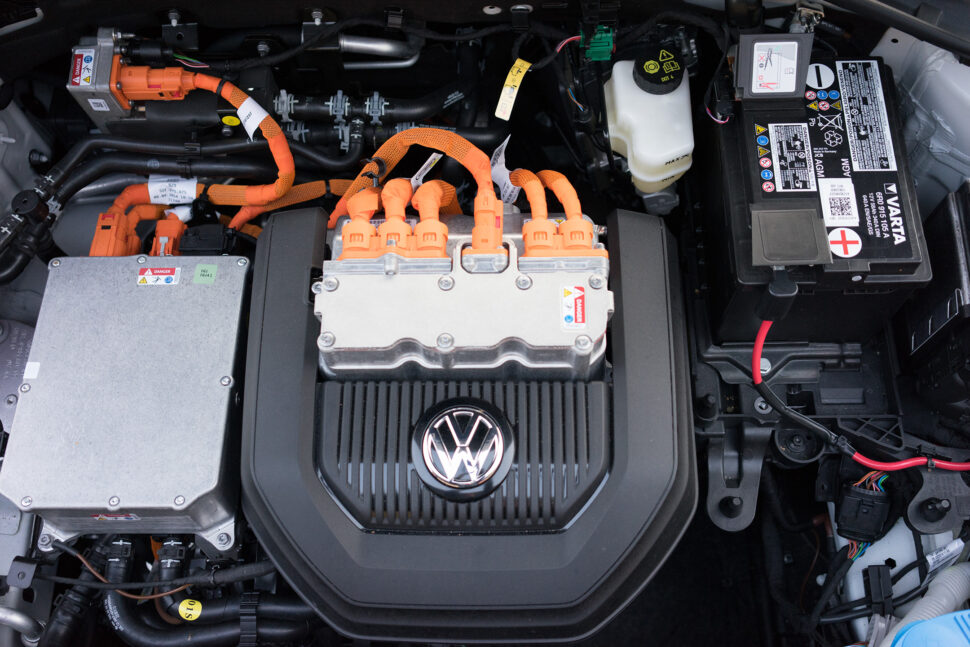 Kraftkällan i E-Golf är ett högspänningsbatteri som VW lämnar åtta års garanti på. Med energiåtervinning går det att till viss del återföra energi till batteriet under körning. Det görs dels genom att utnyttja bromskraften och dels genom vad som bäst kan beskrivas som en modern form av motorbroms. Den kan via växelspaken enkelt ställas in i tre olika hårt ställda bromssteg. Mest kraft återförs till batteriet i det hårdast ställda läget, men då upplevs motorbromsen som något för stark.