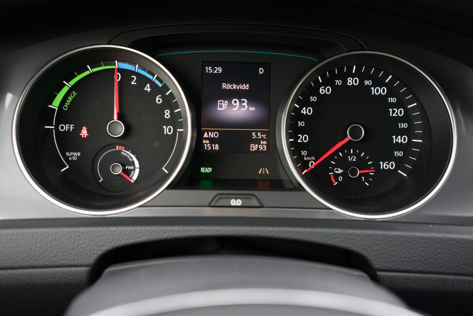 Det klagas ofta på att bilföretagens räckviddssiffror för elbilar är väldigt teoretiska. Men efter att på nätterna laddat E-Golf i ett vanligt eluttag visar färddatorn faktiskt närmare 19 mils räckvidd vid start på morgonen vid val av läge Eco+. Stort plus för Volkswagen för det. Förbrukningen anges till i snitt 1,27 kWh per mil. Vid vårt test uppgår förbrukningen dock till mer än 1,8 kWh, men räckviddssiffrorna håller ändå.