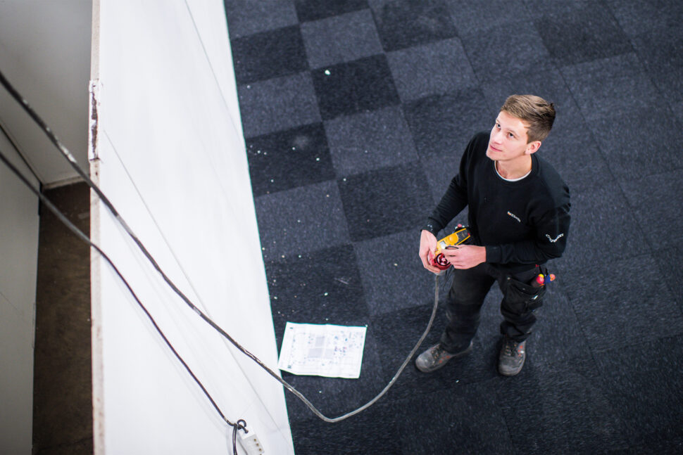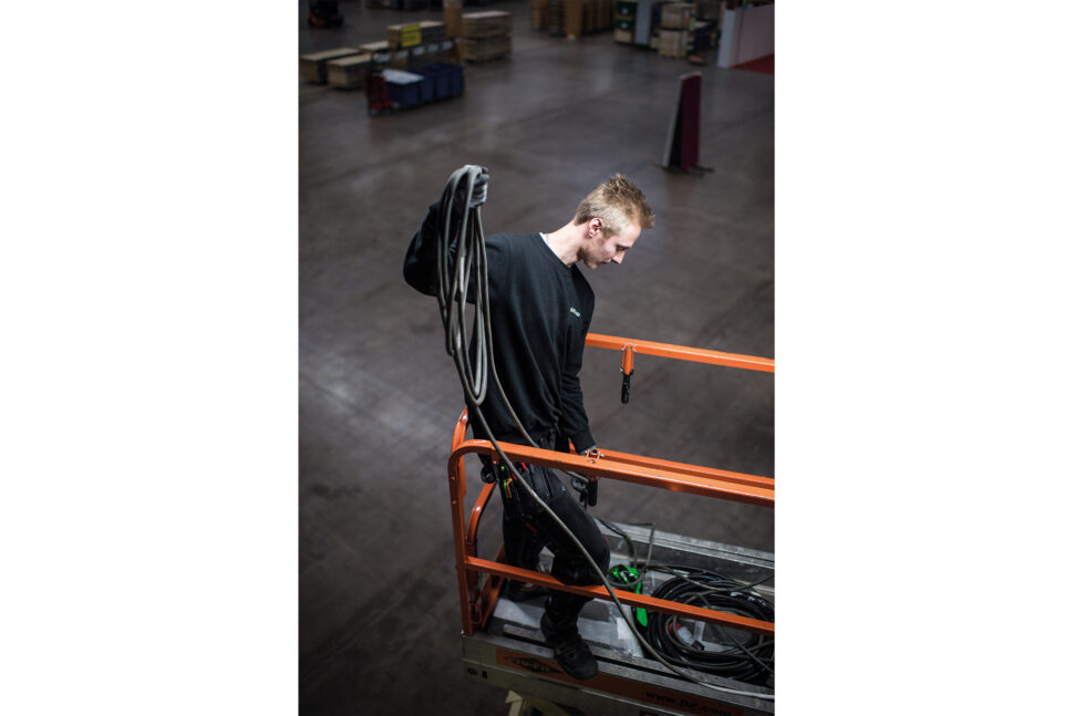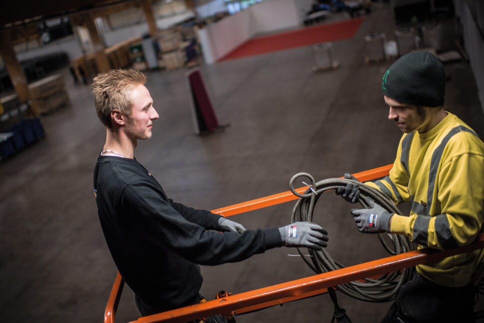 I två av mässhallarna tas elen från skenor i taket som det krävs saxliftar för att komma åt, och i den tredje tas den från golvet. Vid det här laget går arbetet på rutin. Dreamhack har huserat på Elmia i tio år, och Caverion har skött framdragningarna av el i mässhallarna i mer än ett halvsekel.