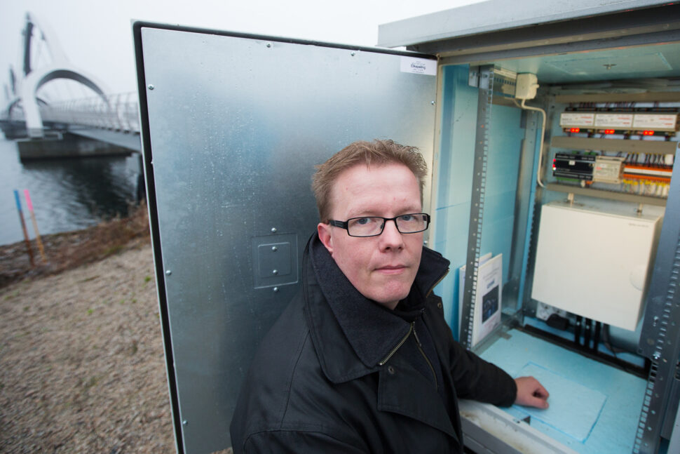 – Utmaningen för mig var att få ihop det rent praktiskt. Det är en speciell situation att installera ute på en flera hundra meter lång bro över vatten. Det är annat än att jobba i ett vanligt hus. Vi jobbade på flottar under och mellan brofästena och fäste upp kablar under bron. Det var knepigt att hitta kabelvägar.