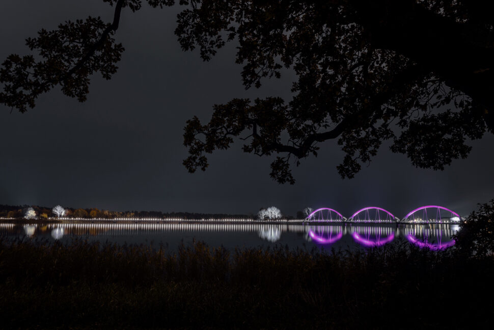 – Mellan varje RGB-strålkastare sitter även en rad med 30st små RGB LED-puckar under bron som lyser ner i vattnet. Hela effektbelysningen styrs med ett Pharos styrsystem från klimatskåpet. Om hela anläggningen är på för fullt så kräver den 2 kW inklusive belysningen över vassen och trädbelysningen på de båda öarna. Funktionsbelysningen, som är LED-ljus, sitter längs räcket och lyser ner mot vägbanan hela vägen över bron. Den drar cirka 500 Watt.