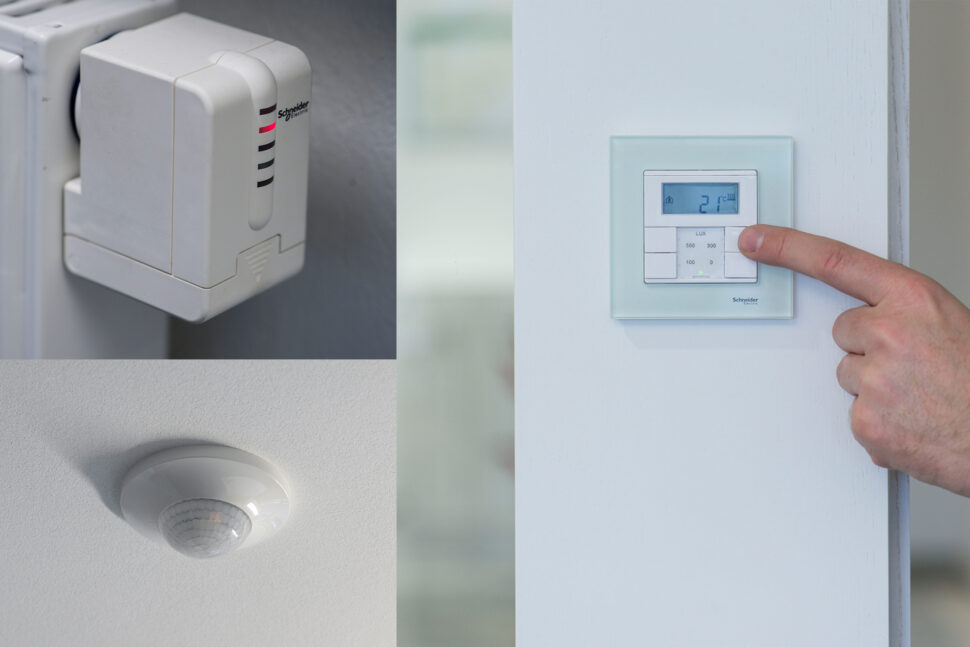 KNX-systemet håller ihop alla funktioner i byggnaden. Så när siste man går hem är det inte bara ljuset som släcks utan då dras och värme och ventilation – och sommartid kylan om den är på – ner till lägre nivåer. Fläktarna i ventilationsanläggningen är förstås varvtalsreglerade och tryckstyrda.