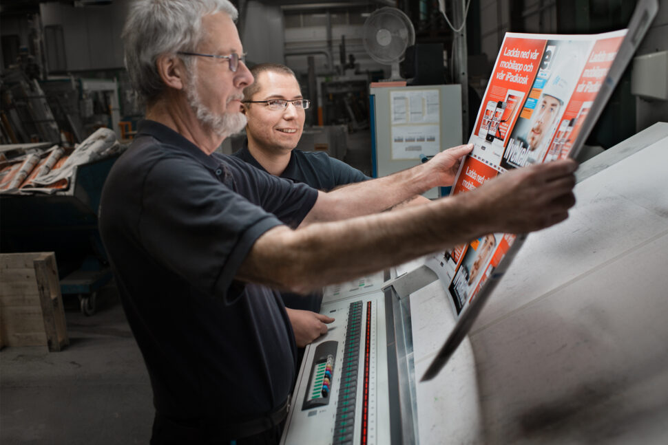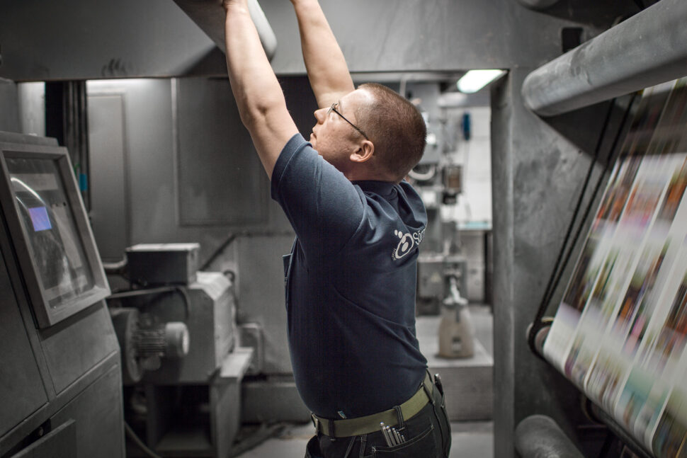 Det är strax efter lunch en dag i mitten av januari, och den 16 000 kvadratmeter stora anläggningen är inbäddad i snö. Inne i tryckeriet luktar det färg och vid en av väggarna står en 50 meter lång rullpress med en pappersrulle på cirka 2000 kilo i ena ändan. Maskinen styrs från ett inglasat operatörsrum.