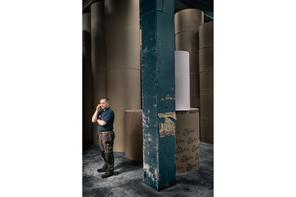 Vi går vidare, och försöker att inte vara i vägen för truckar som kommer farande med träpallar och stora pappersrullar. I nästa hall står ytterligare en rullpress, fast modernare, ungefär tio år gammal. Mathias förklarar att grundprincipen i alla tryckpressar är densamma, men att tekniken går framåt hela tiden.