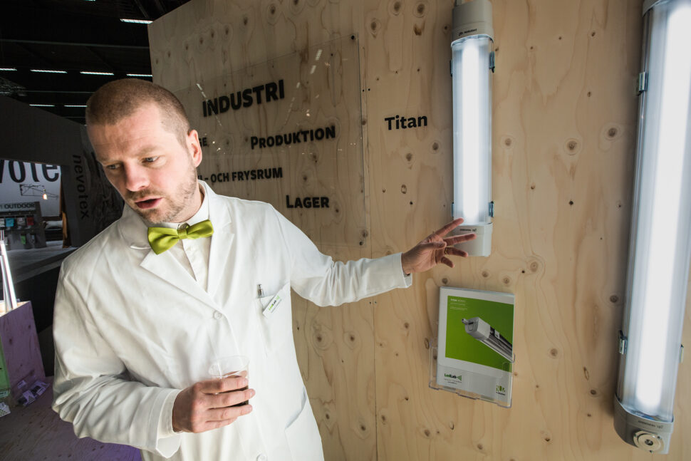 Tobias visade också den andra nyheten, garagearmaturen Titan. I utvecklingsarbetet med den armaturen har LedLab tagit fasta på behovet av att blända ner det ljusintensiva LED-ljuset.