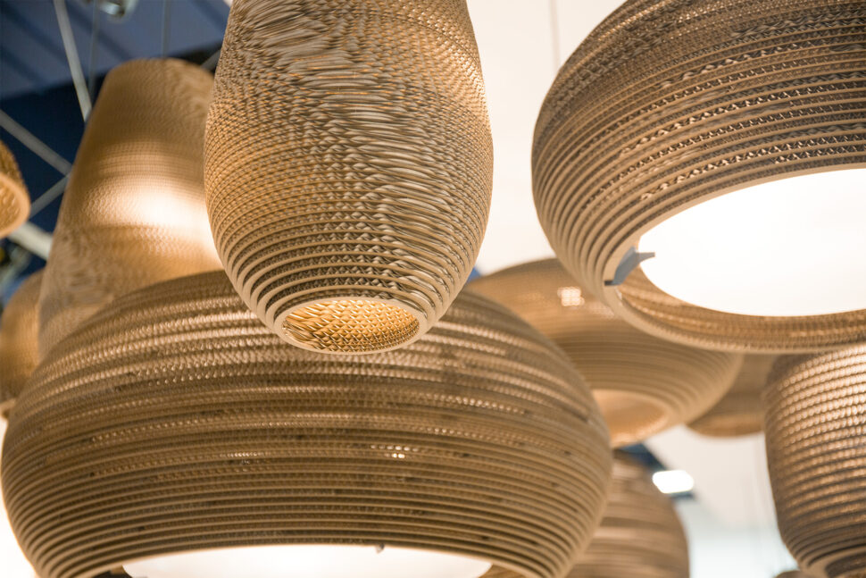 Hos Graypants Sweden visades lampor med skärmar som tillverkats av återvunnen wellpapp i en rad olika utföranden. Trendriktigare än så kan det knappast bli – ekologiskt och naturligt. Skärmarna precisionsskärs med laser och monteras för hand med hjälp av giftfritt lim innan de behandlas med ett miljövänligt flamskyddsmedel.