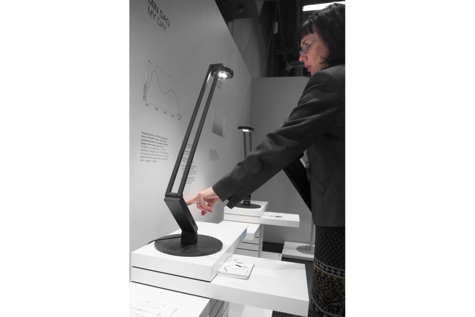 Ljuskällan är förstås LED med en ljusstyrka på 1 000 lux och reglerbar färgtemperatur från 2 700 till 6 500 K. Personer som arbetar i kontorslandskap och byter arbetsplats från dag till annan identifieras via bluetooth i vars och ens mobiltelefon så att de personliga inställningarna tillämpas i den armatur man arbetar vid för tillfället. Fiffigt.