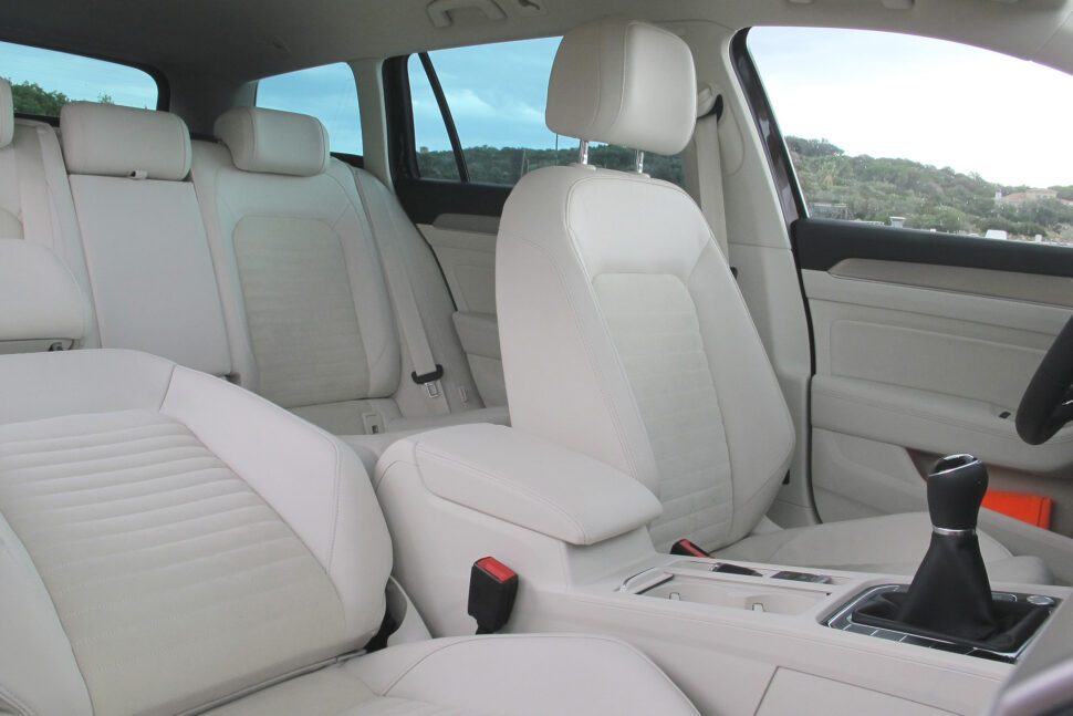 Nya Passat finns både som fyrdörrars och kombi där måtten mellan de båda karossformerna är desamma. Jämför vi med den avgående Passat är måtten i princip desamma. Inredningen känns modern. De runda instrumenten – varv- och hastighetsmätare – har minskats i storlek och flyttats isär för att mellan dessa ge plats för en display som visar viktig information. Välj till Active Info Display och få navigation även på en stor färgskärm mellan de båda instrumenten. I Head-up display visas aktuell hastighet, navigationssymboler och annan viktig information i mitt synfält genom vindrutan. En finess är att två mobiltelefoner kan kopplas upp samtidigt – exempelvis en företagstelefon och en privat telefon.
