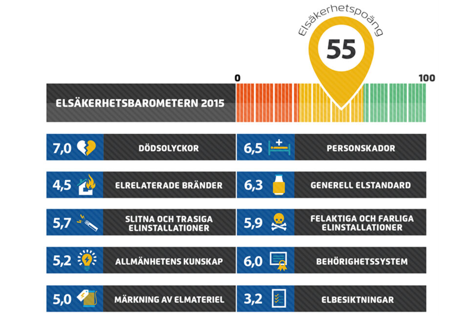 Sverige får 55 av totalt 100 elsäkerhetspoäng i den nya elsäkerhetsbarometern, EIO:s statistiksammanställning. Syftet med den är att ge en helhetsbild över elsäkerheten i Sverige.