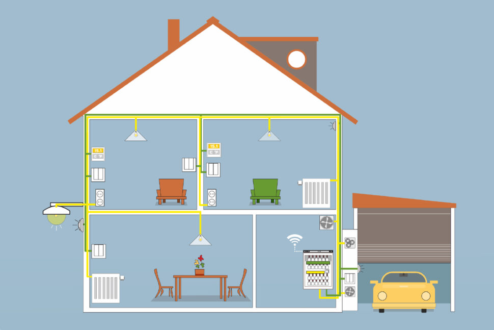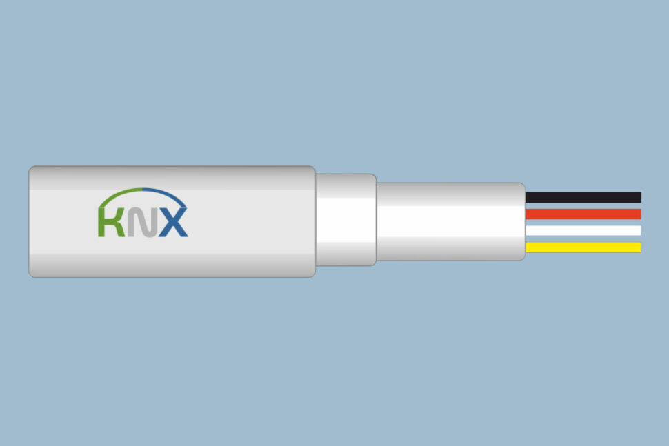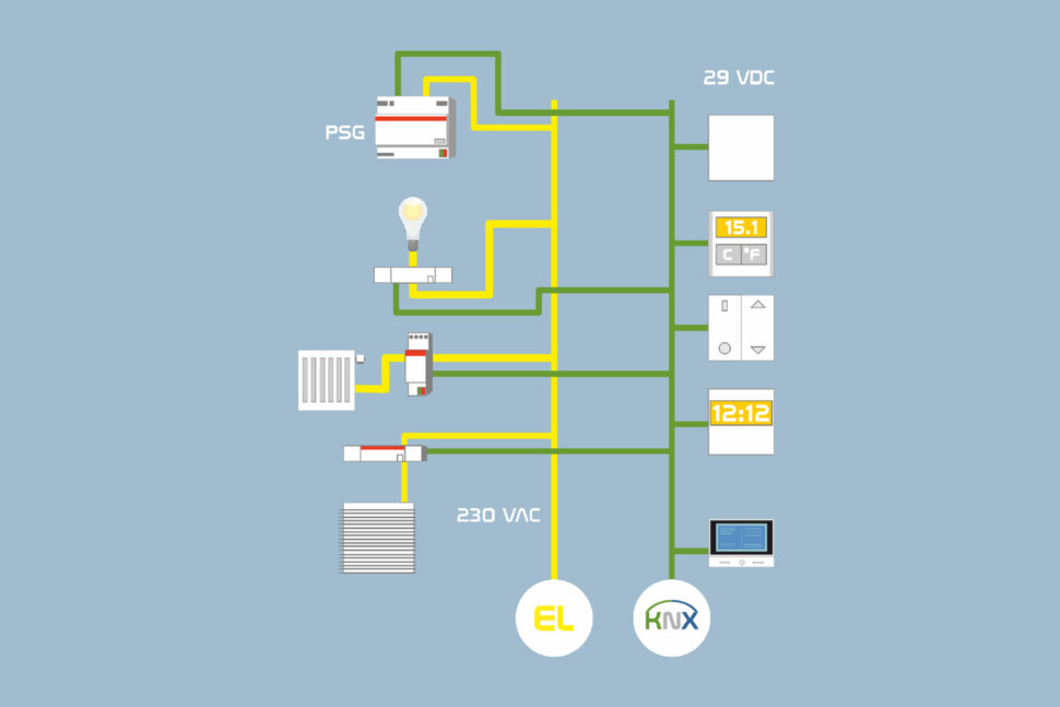Med KNX slipper elektrikern dra trådar kors och tvärs för att göra det möjligt att manövrera en rumsbelysning från olika strömställare. Istället dras en enda kabel med fyra ledare (två används, två i reserv). Detta är den så kallade KNX-bussen (grön i figuren).
