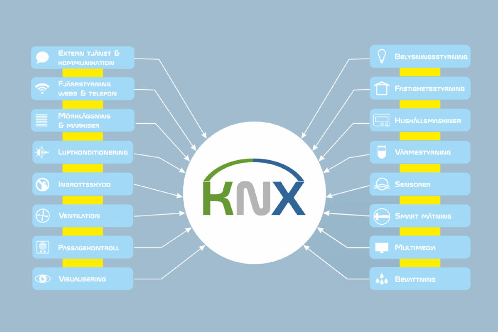 KNX är en standard som används av hundratals tillverkare i tusentals olika apparater och elutrustningar, styrsystem och annat. Alla KNX-produkter kan kopplas till varandra. Därför kan KNX hantera massor av olika funktioner i en byggnad. Här i figuren ser du några av de viktigaste exemplen.
