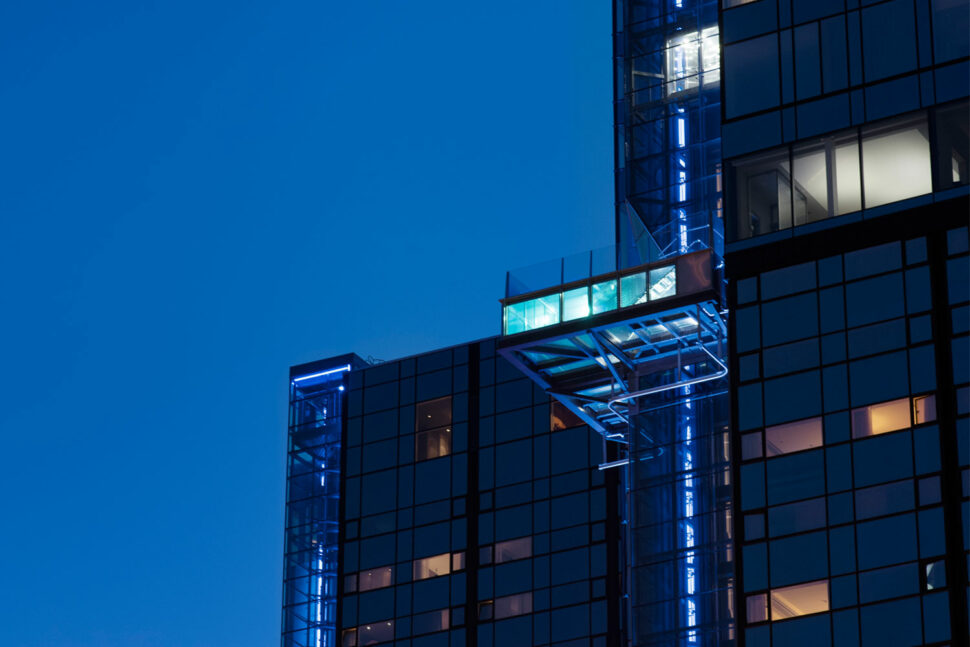 Här var uppdraget att installera LED-ljus i hissarna. Först ut var det västra tornet. I de höga hiss-schakten monterades LED-profiler med specialfästen. Tillsammans skapar de linjer av ljus som sträcker sig från marknivå upp till taket och som också här kan regleras i olika färger.