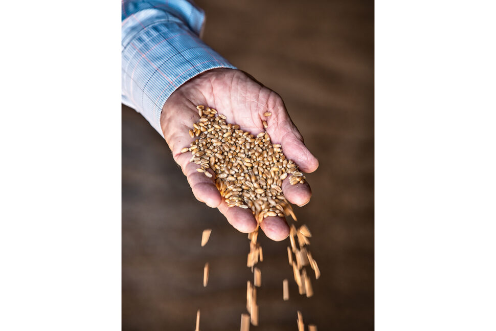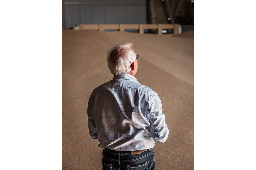 Solens strålar silar igenom ladans röda träplankor. Här inne torkas och förvaras årets skörd. Spannmålstorken, som tar del av solelen, kan hantera 200 ton spannmål per dygn. Årets skörd har lagrats i maximal omfattning, högarna av vete har hunnit bli flera meter höga och spiller över på backen framför ladans dörr.