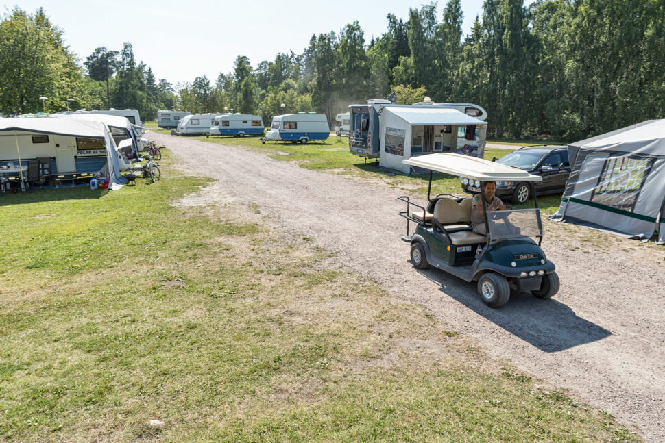 Jimmy hämtar upp oss vid entrén till campingen i en av de små gröna eldrivna golfbilar som de anställda kör omkring i. Klockan är strax efter tio, och utanför husvagnar och tält sitter familjer och äter frukost, eller slappar i solen. Några är på väg till parken, som precis öppnat.