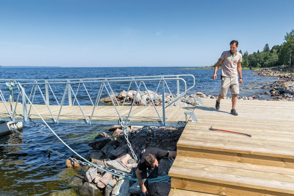Sedan bär det av ner till småbåtshamnen för ett mer planerat uppdrag. Limöbåten, som från och med i år lägger an vid Furuviksparken, ska få ett 32 ampere uttag för att kunna ladda batterierna. Jimmy låser upp ett skåp, sätter sig på den solvarma bryggan och monterar uttaget till ljudet av kluckande vågor.