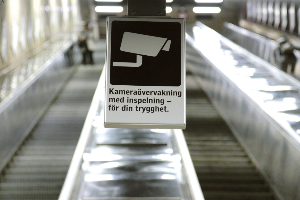 ”Kameraövervakning med inspelning – för din trygghet”, står det på ett plakat högt upp på en av pelarna vid T-centralens tunnelbanestation. Ovanför texten finns en stiliserad bild av en övervakningskamera. Elinstallatören har hälsat på hos Stockholms Lokaltrafik, SL, för att se hur systemet fungerar.