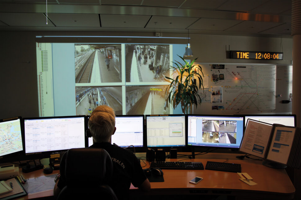 Men vem tittar på bilderna egentligen? Det ska vi snart få veta. Jan Ekström drar sitt passerkort i en tung dörr märkt “Trygghetscentral”, och släpper in oss i ett stort ljust rum med stora skrivbord i björk, grå heltäckningsmattor, färgglada gardiner, ett akvarium, och en fikahörna. På ena långväggen projiceras en bild från en stationsperrong, och bredvid hänger en whiteboard med en stor karta över tunnelbane- och pendeltågsnätet.