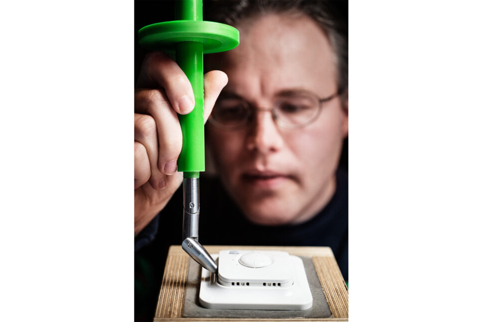 Framför honom på testbordet ligger en tjock bunt papper med detaljerad beskrivning för hur testerna av termostaten ska utföras enligt den aktuella standarden. Bredvid ligger den lilla termostaten som David är i färd med att testa. Han plockar fram ett standardiserat provfinger i stål och kontrollerar apparatens beröringsskydd.