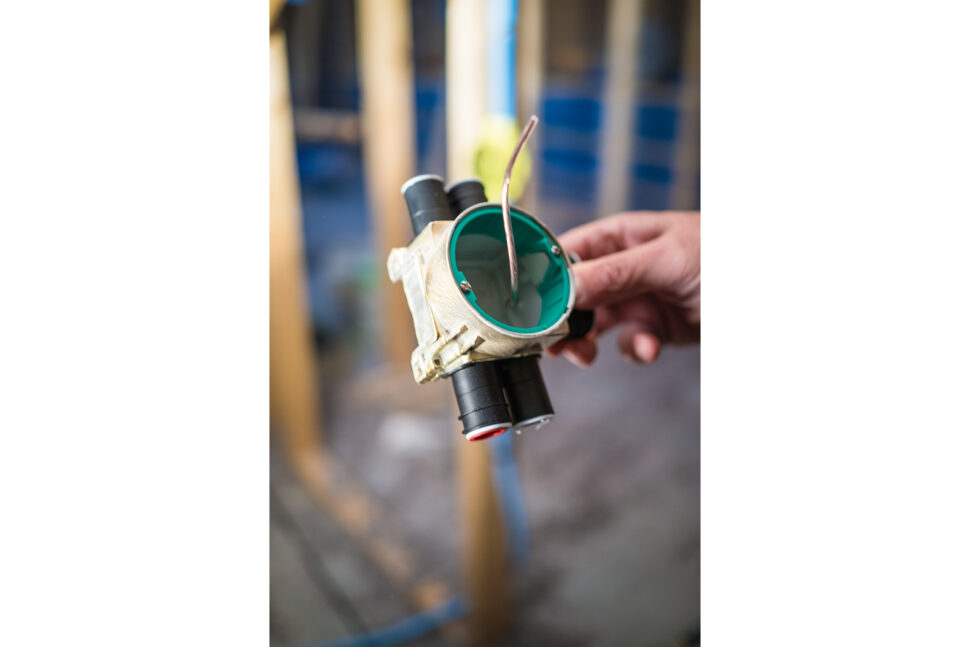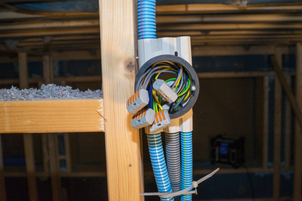 Flexaray-rören finns också med fördragen ledningstråd, tre eller fem ledare. I dem är de strömförande ledarna tvinnade – en åtgärd som också minskar den elektromagnetiska strålningen. För att installationen ska bli bättre avskärmad rekommenderar sedan Bo Jonsson att installatören väljer skärmade dosor för sitt montage. Sådana finns bland annat i Schneider Electrics sortiment.