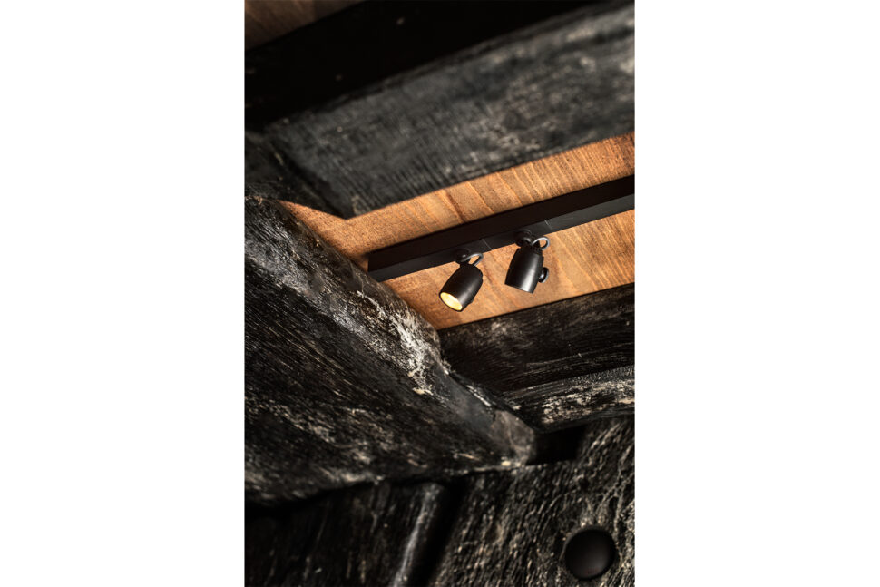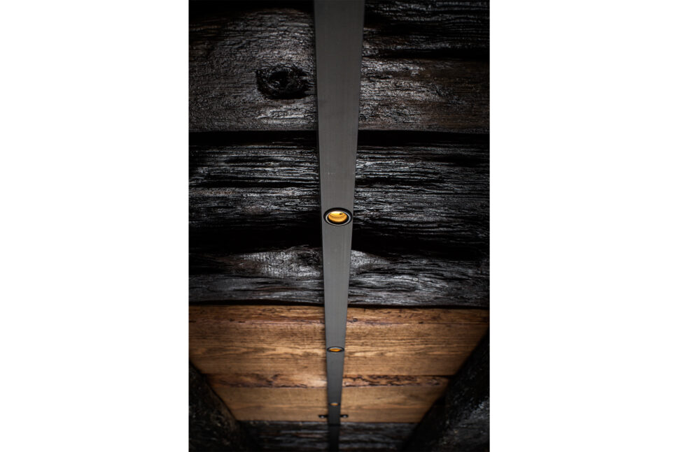 – Först då var LED-tekniken mogen och innan dess var lysrör enda alternativet. Det skulle aldrig gått att sätta halogen så nära brännbart material, säger Anders Westlund, och pekar upp mot takbjälkarna, där svarta strömskenor i aluminium är fästa mot träet.