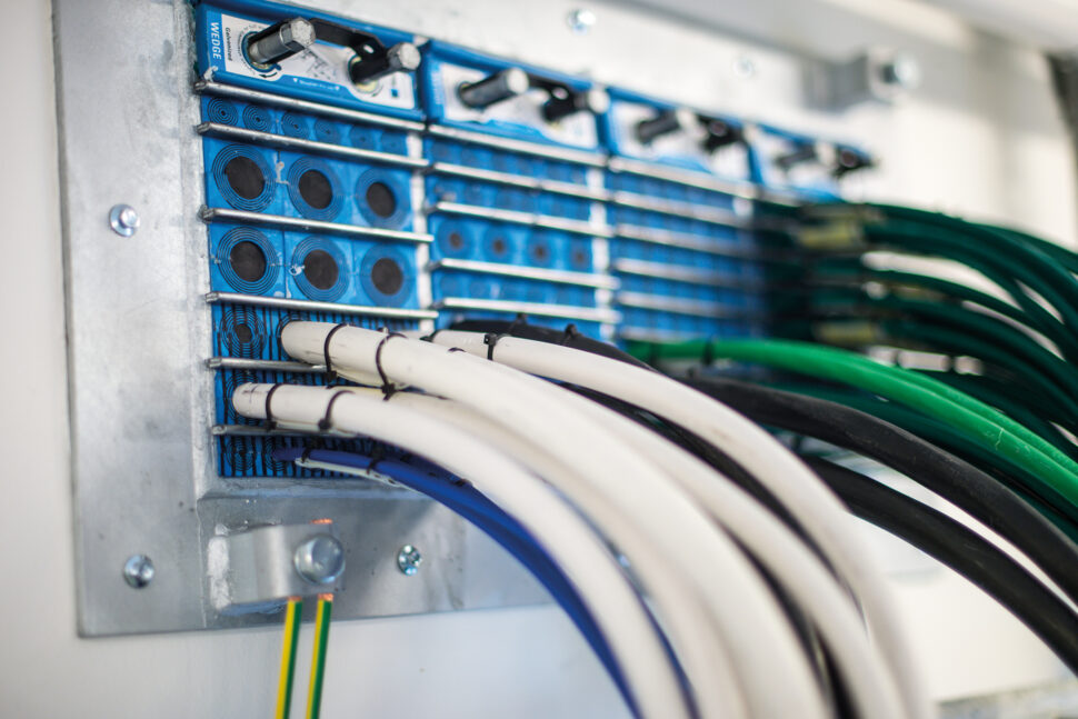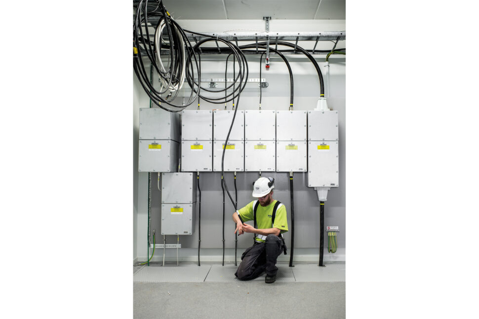 – Här är höga krav på EMC-skydd, så vi har fått montera avledarlådor på allt inkommande kablage så att hela byggnaden är elektromagnetiskt avskuren från omgivningen. I vissa utrymmen finns spänningsavledande mattor och det är väldigt omfattande jordningskrav i det här projektet, liksom gott om separata kanalisationer för avskärmade ledningar.