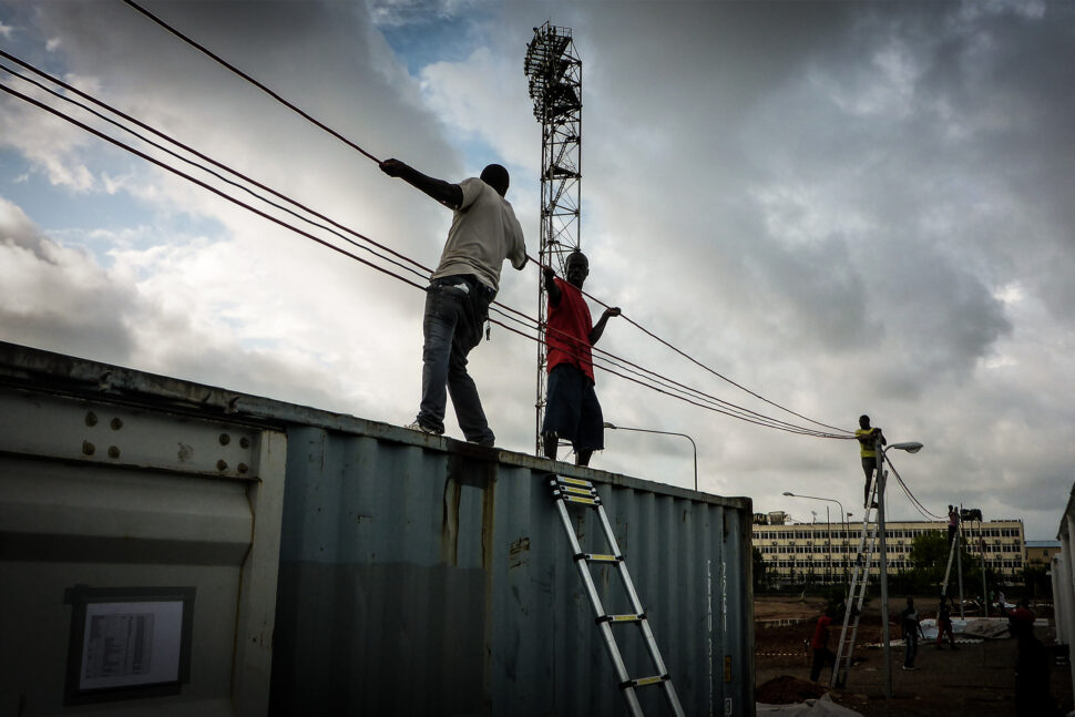 Ebolacentret ligger 15 minuters promenad från hotellet, och cirka 300 personer ur lokalbefolkningen jobbar i skift för att färdigställa det. Mycket är redan på plats, som staket, vvs, dieselgeneratorer, och gjutna bottenplattor för sjukvårdstälten. Nu är det dags för Lees team att ta itu med sitt uppdrag – att resa de 24 prefabricerade byggnader som flugits hit i containers från Örebro och som skall bli sjukstugor, omklädningsrum, kontor, och vilorum för de internationella hjälparbetarna på centret.