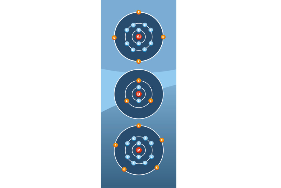 I solcellens övre skikt är kiselatomerna ’dopade’ med grundämnet bor (B) för att kislets egenskaper ska ändras. Boratomen, i mitten, har bara fem elektroner, varav tre är valenselektroner. När bor binder till kisel uppstår en ofullständig bindning som kan dra till sig en fri valenselektron i närheten. Denna elektron lämnar efter sig ett ’hål’ som kan röra sig fritt i kristallen. Boratomen bildar ett negativt område i kristallen. Kiselkristaller som dopas med bor sägs vara ’P-dopade’.