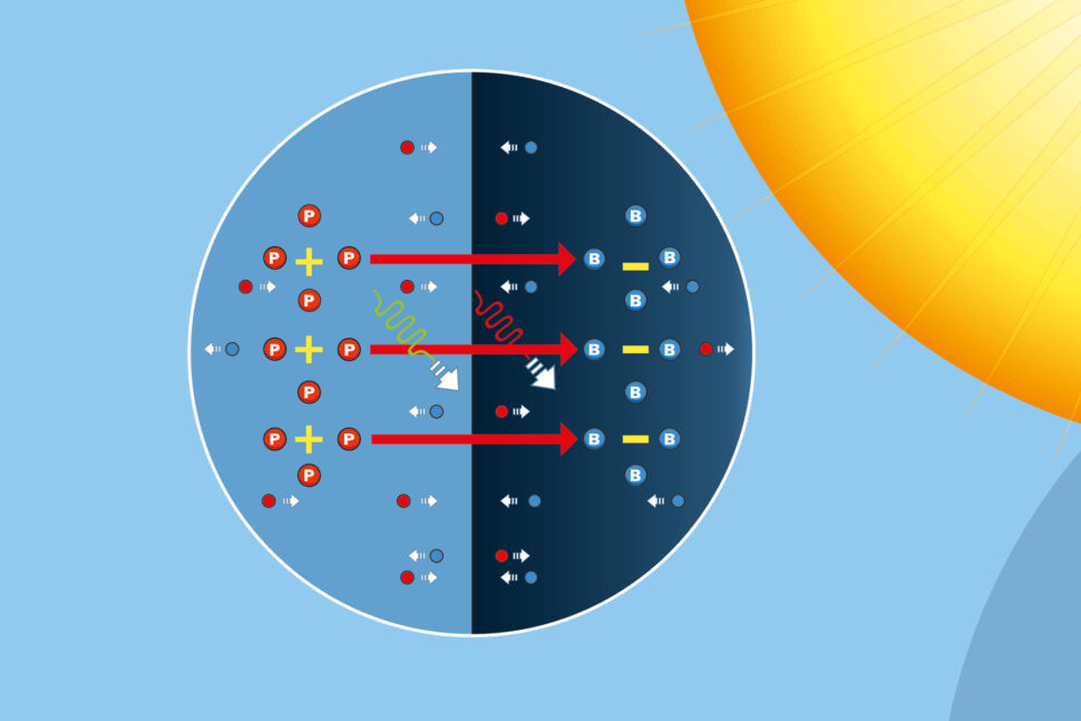 När fotoner träffar det fosfordopade skiktet börjar elektroner röra sig ner till det bordopade. De negativt laddade hålen rör sig uppåt till borskiktet. Tack vare PN-kopplingen kvarstår spänningen i cellen så att den kan matas från det undre skiktet tillbaka till det övre – via en last, som i det här fallet symboliseras av en glödlampa. Lampan lyser!