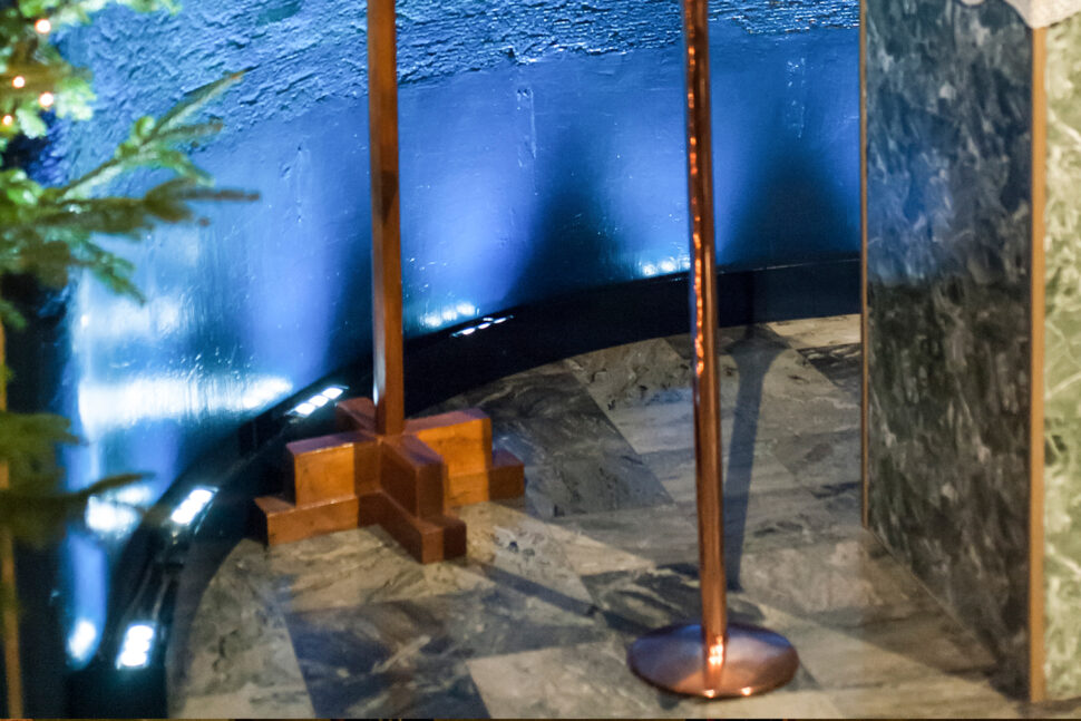 Anna berättar att alla armaturer dolts så gott det går. En del har gömts bakom balkar i taket, andra är inmålade mot tak och väggar i exakt samma nyans som ytan de monterats på.