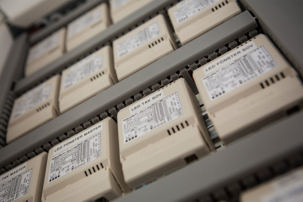– Det har verkligen varit kul att göra det här huset och jag skulle nog ha gjort det med KNX under alla omständigheter. Som de flesta moderna hus har det här massor av ljuspunkter och det mesta är förstås dimbart. Så jag gjorde en lösning med DALI för ljusstyrningen, vilket innebar att en massa dimmers ute i huset kunde ersättas av en enda i centralen, samtidigt som dimmringen kan styras mer exakt.