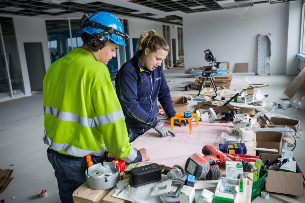 I september 2014 började Caverion med elinstallationerna och i oktober hade Martin Wass och hans kollegor lagt ner 11 000 meter markrör och under våren fick de upp 3 500 meter kabelstege och 10 000 meter belysningsskena med 2 700 armaturer. På skenan sitter dessutom 5 000 meter trådstege monterat.