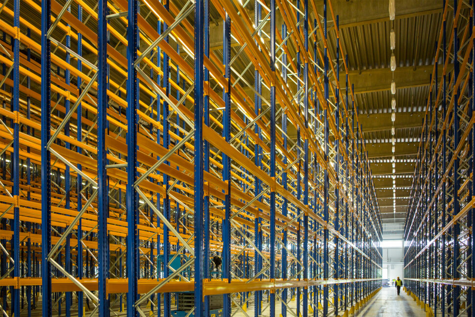 Inne på lagret sitter armaturer som är T5-lysrör med 2x80W. All armatur har Dali-styrning som gör att zoner där ingen aktivitet pågår droppar ner till tio procents belysning. När personalen kliver in i ett pallställ stiger belysningen till max just där.