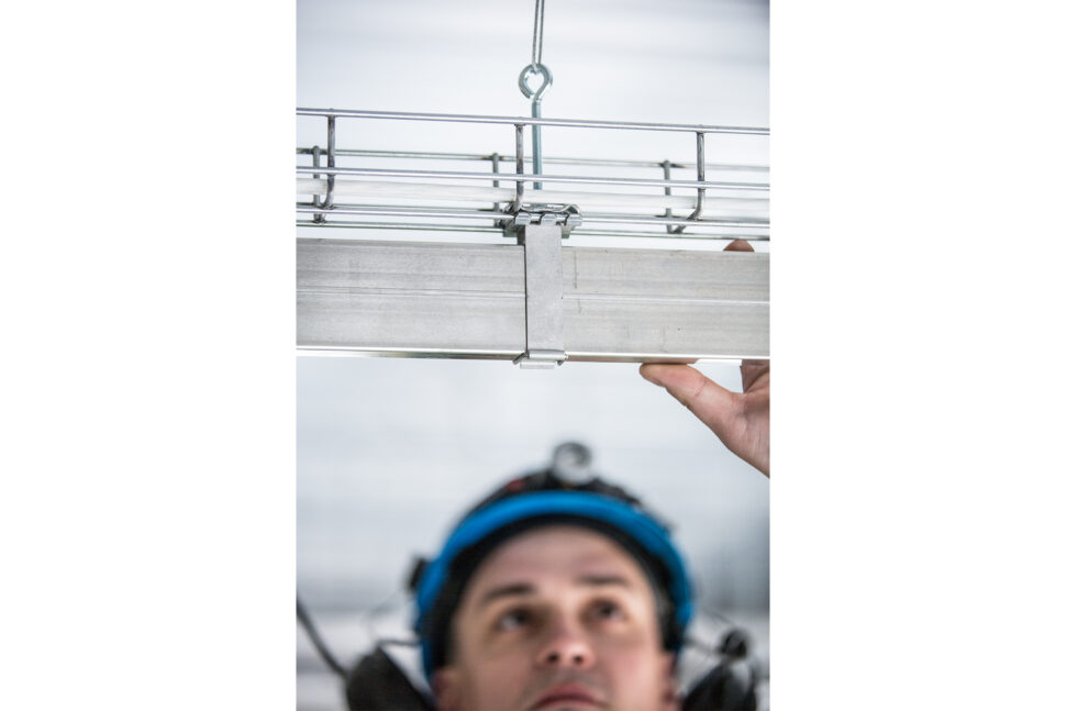 Som exempel nämner han att strömskenan hade en dimension som inte fanns tillgänglig med trådstege, så där har de själva fått hitta på en konstruktion som fungerar. Ett annat exempel är de 8 000 vajrar som håller upp armaturen i belysningsskenan.