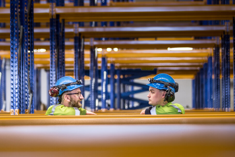 Med 68 000 kvadratmeter är Rustas nya lager utanför Norrköping en riktig koloss. Att installera el i byggnaden innebar en ny erfarenhet för kollegorna Martin Wass och Fredrik Kling från Caverion El i Östergötland. Väggar och tak fanns redan på plats och elinstallationerna hade kommit långt när väl golvet började gjutas.