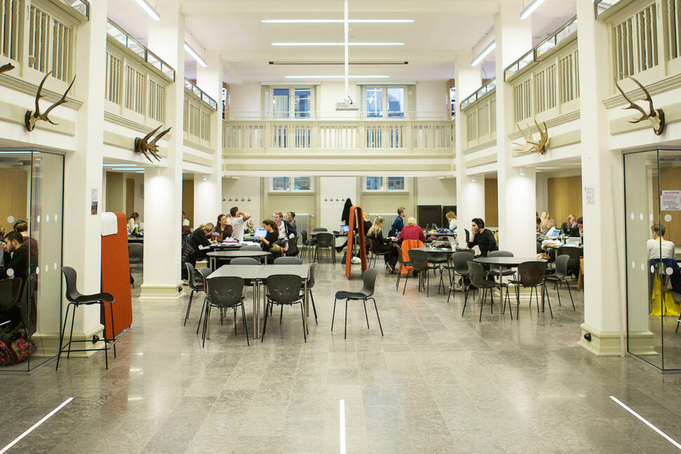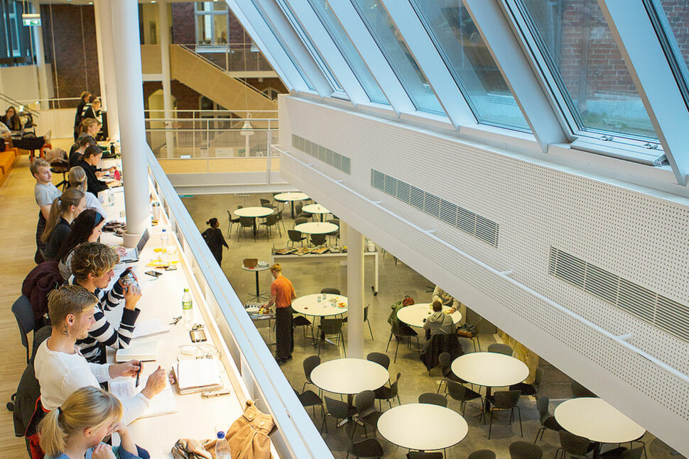 – Arkitekten talade också mycket om behovet av ”spaningsytor” som ska hjälpa besökarna att hitta varandra – många män och kvinnor finner ju varandra under studietiden. Det är därför arbetsborden i biblioteket placerats längs balustraden, där du kan titta ner över entrén med fikabord och andra gemensamma utrymmen, förklarar Douglas Hillgrund.