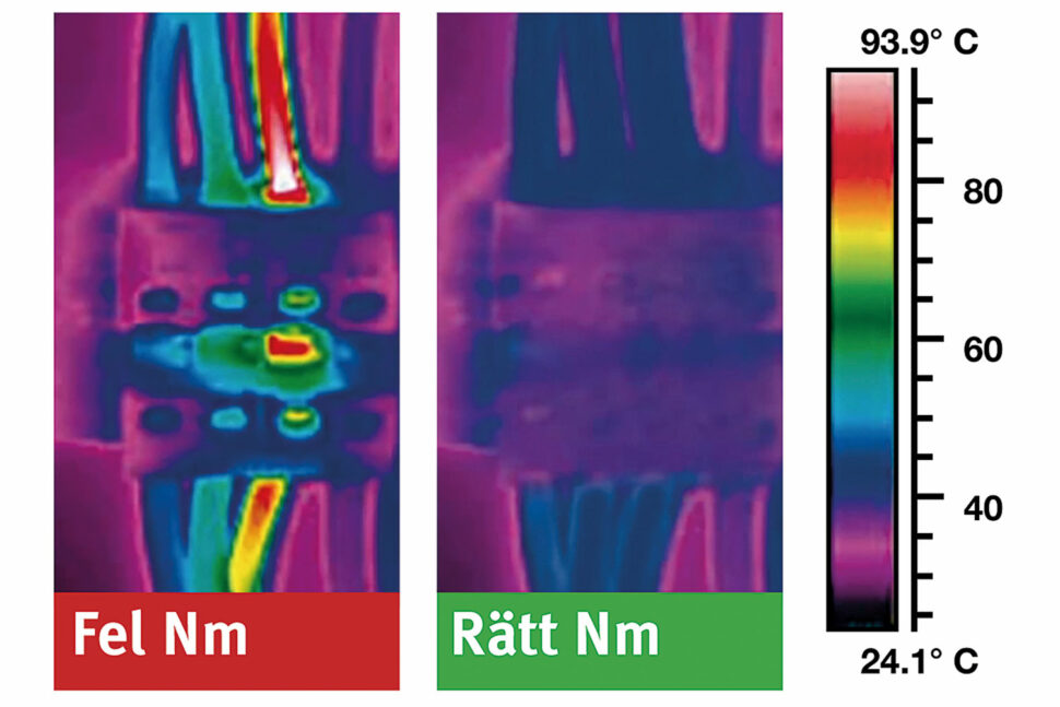 — Om anslutningen sitter för löst ökar motståndet och därmed risken för det som kallas varmgång och som kan leda till brand. Om montören i stället drar för hårt kan det uppstå sprickor som också försämrar kontakten och leder till samma problem. Att dra med rätt moment är alltid att rekommendera, säger Joakim Grafström.