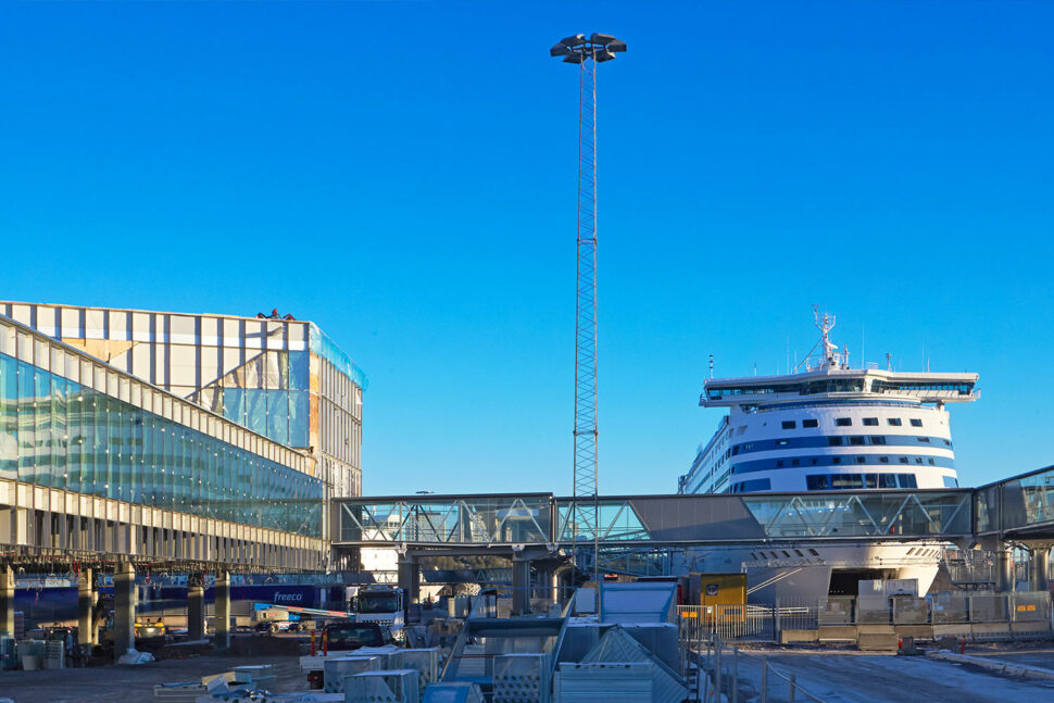Utanför byggnaden pågår slutfasen av ett annat installationsprojekt som Bravida arbetat med. Det projektet omfattar infrastrukturen kring terminalen – kajanläggningar, påfartsramper, tullhus, gångbroar och annat. I det projektet ligger också kraftförsörjningen till terminalen och till färjorna. De fem nya färjelägena får nu kraftstationer som matar fartygen med elkraft från land när de ligger i hamn.