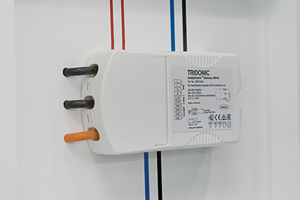 Även Zumtobel visade upp reglerbara belysningslösningar som ska vara smidiga att installera. Ett exempel är styrsystemet Ready2mains. Det kommunicerar via det vanliga elnätet för att konfigurera och dimra belysning. Inga nya kablar behövs. Det räcker att installera en gateway direkt på det befintliga elnätskablarna och byta ut de gamla armaturerna mot LED-armaturer med driftdon som stöder styrsystemet.