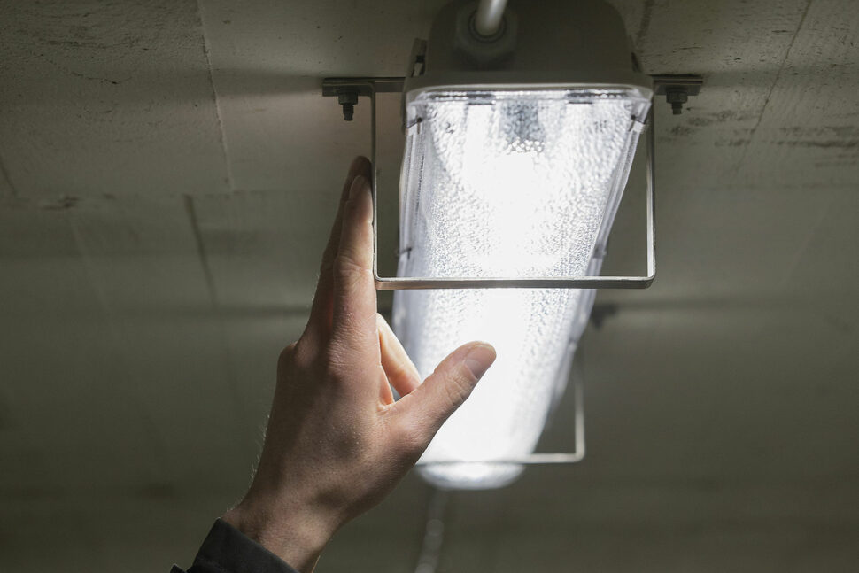 Sedan ska samtliga cirka 170 LED-armaturer förses med två byglar vardera i rostfritt stål. Allt enligt SR15, som skyddsrumsreglerna heter.