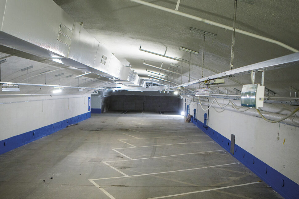 Det kombinerade garage och skyddsrummet byggdes redan under kalla kriget på 1960-talet, men har stått oanvänt på senare år. Vattenfall lämnade området 2012, och i fjol köpte Stockholm Parkering anläggningen. Sedan dess har alla gamla installationer här nere i berget rivits ut.