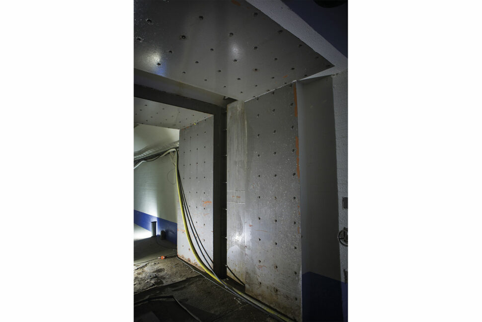 Då ska många funktioner kunna styras från bergrummets lilla expeditionsrum. Här står Jimmy Jonell och installerar kraftmatningen till indikeringen som visar om dörrarna är öppna eller stängda. I expeditionen kan man även styra belysningen manuellt och prata med personer som vill bli insläppta i skyddsrummet via porttelefonen som Mforce har installerat. Ett högtalarsystem för att ropa ut meddelanden ingår också i entreprenaden.