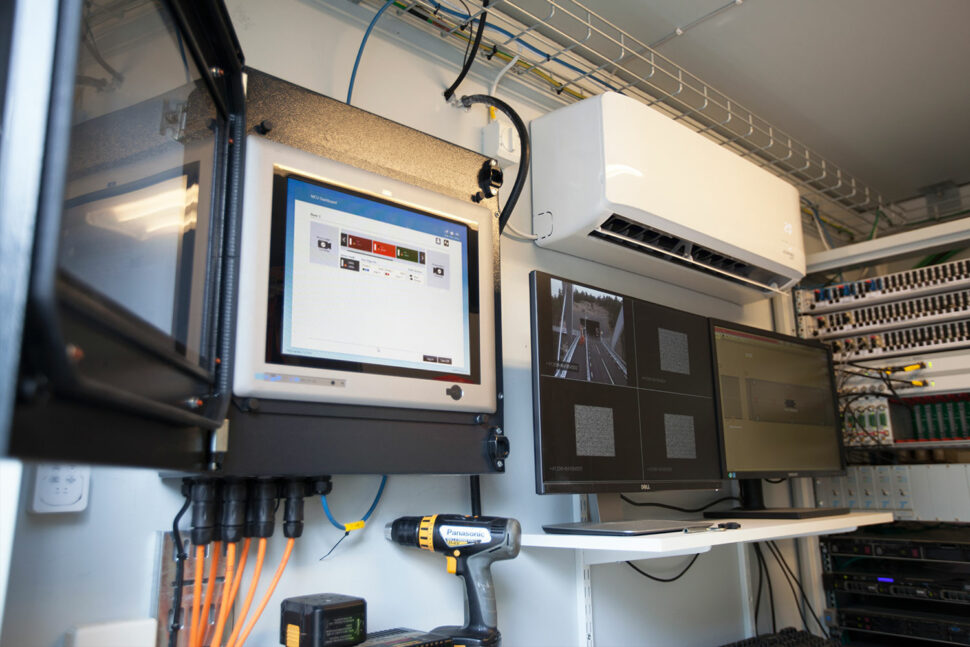 I Elektrotjänst entreprenad ingick en rad saker förutom den uppkopplade LED-belysningen. Företaget har installerat övervaknings- och luminanskameror, varningsskyltar för brand och utrymning, bommar, armaturer på barriärelementen, två batteridrivna UPS:er och alla installationer i det teknikhus som är anläggningens hjärta. Här finns bland annat elcentraler, dataservrar för larm och kameraservrar för de sammanlagt åtta övervakningskamerorna i och utanför tunneln.