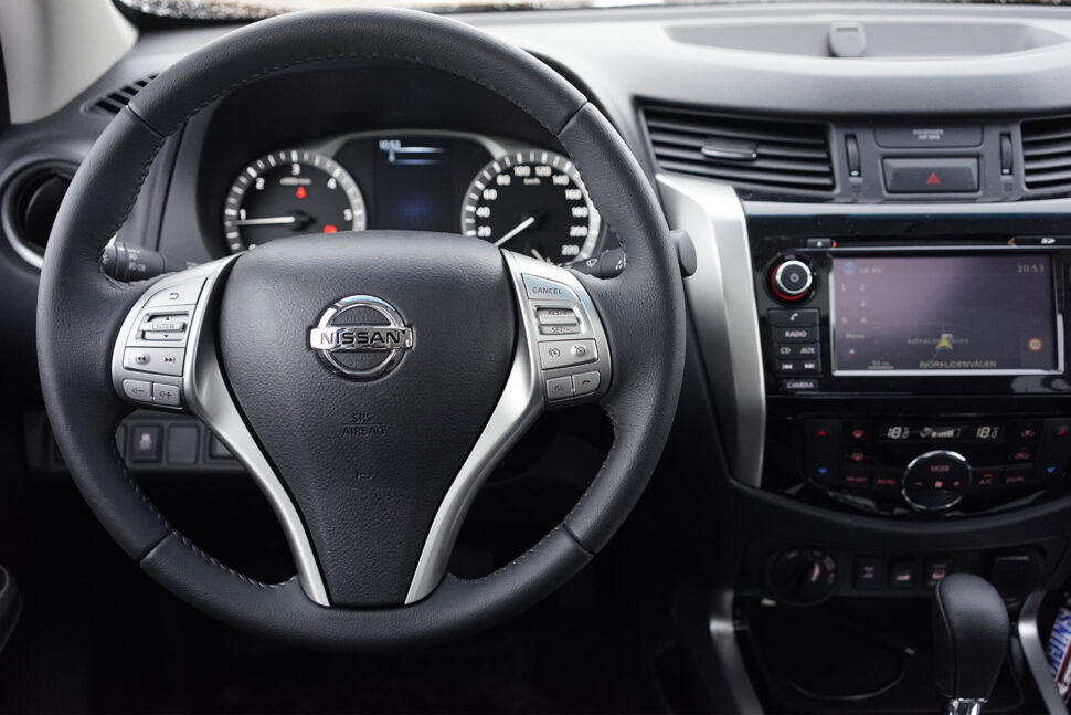 Kanske kan det börja bli ändring på det nu. Till nya Nissan Navara finns både frontkollisonsvarnare och autobroms. En annan praktisk sak, inte minst i en hög bil som är 5,3 meter lång, är möjlighet till 360 graders kamerabild runt bilen. Det är lika användbart i parkeringsgaraget som i terrängen.